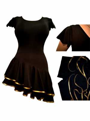 Платье для спортивных бальных танцев, чёрного цвета, на юбке кант – золото. Рукава крылышки, шортики вшиты. Ткань бифлекс.