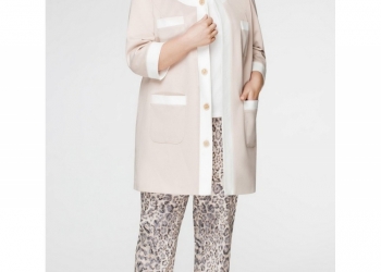 Тройка - тренч, блузка, брюки. Тренч на подкладке, ткань трикотаж. Длина по спинке 86 см, рукав три четверти 48см.