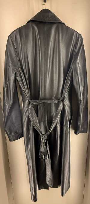 Плащ черного цвета,натуральная кожа,на подкладе.Длина изделия 114 см,длина рукава 61см, плечи 40 см.