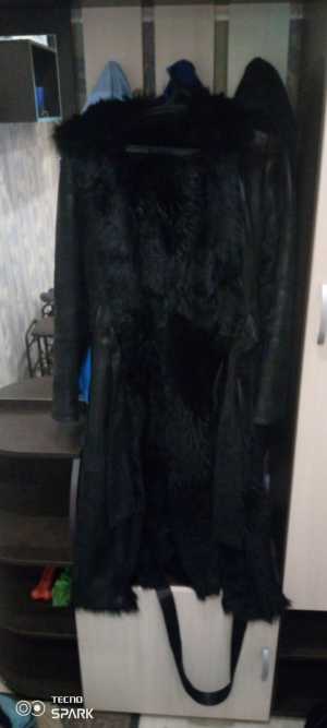 Продам женскую натуральную дубленку.Цвет черный,длинная с капющеном на капющене мех.Примерный размер 55-60.