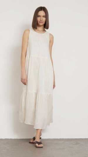 Сарафан спокойного молочного цвета в тонкую вертикальную полоску выполнен из натурального льна и хлопка, на подкладке из...