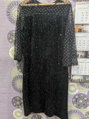 Платье новогоднее с пайетками черного цвета. Верх платья и рукава сеточка с блёстками.