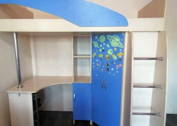 Кровать детская со столом, шкофом, спальным местом и полочками в голубом оттенке